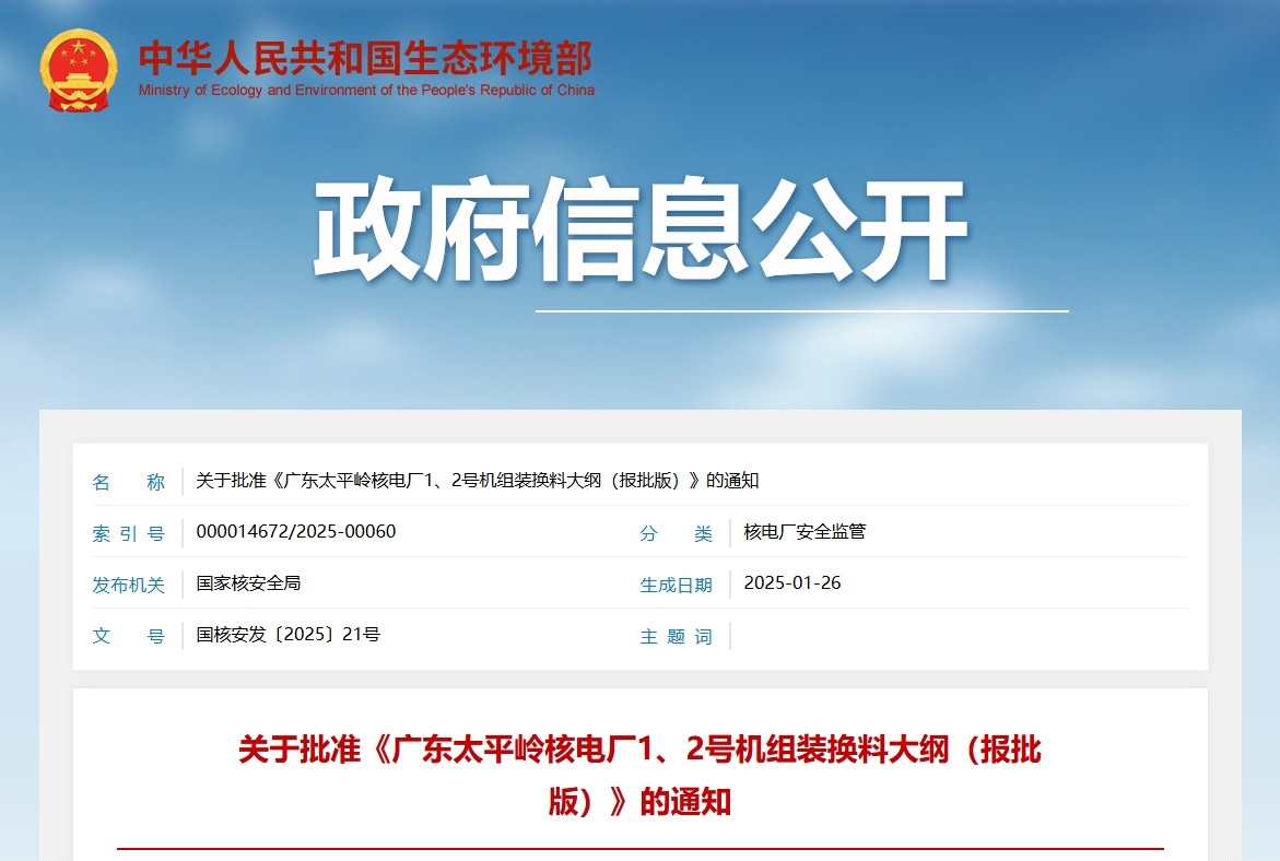 關(guān)于批準(zhǔn)《廣東太平嶺核電廠1、2號(hào)機(jī)組裝換料大綱(報(bào)批版)》的通知