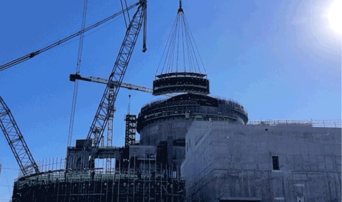 1月16日14時27分,歷時7小時,遼寧徐大堡核電3號核島反應堆廠房外穹頂非能動水箱集成模塊順利吊裝就位,標志著“土建鋼筋混凝土結構+不銹鋼水箱+設備”集成模塊化施工技術應用成功。