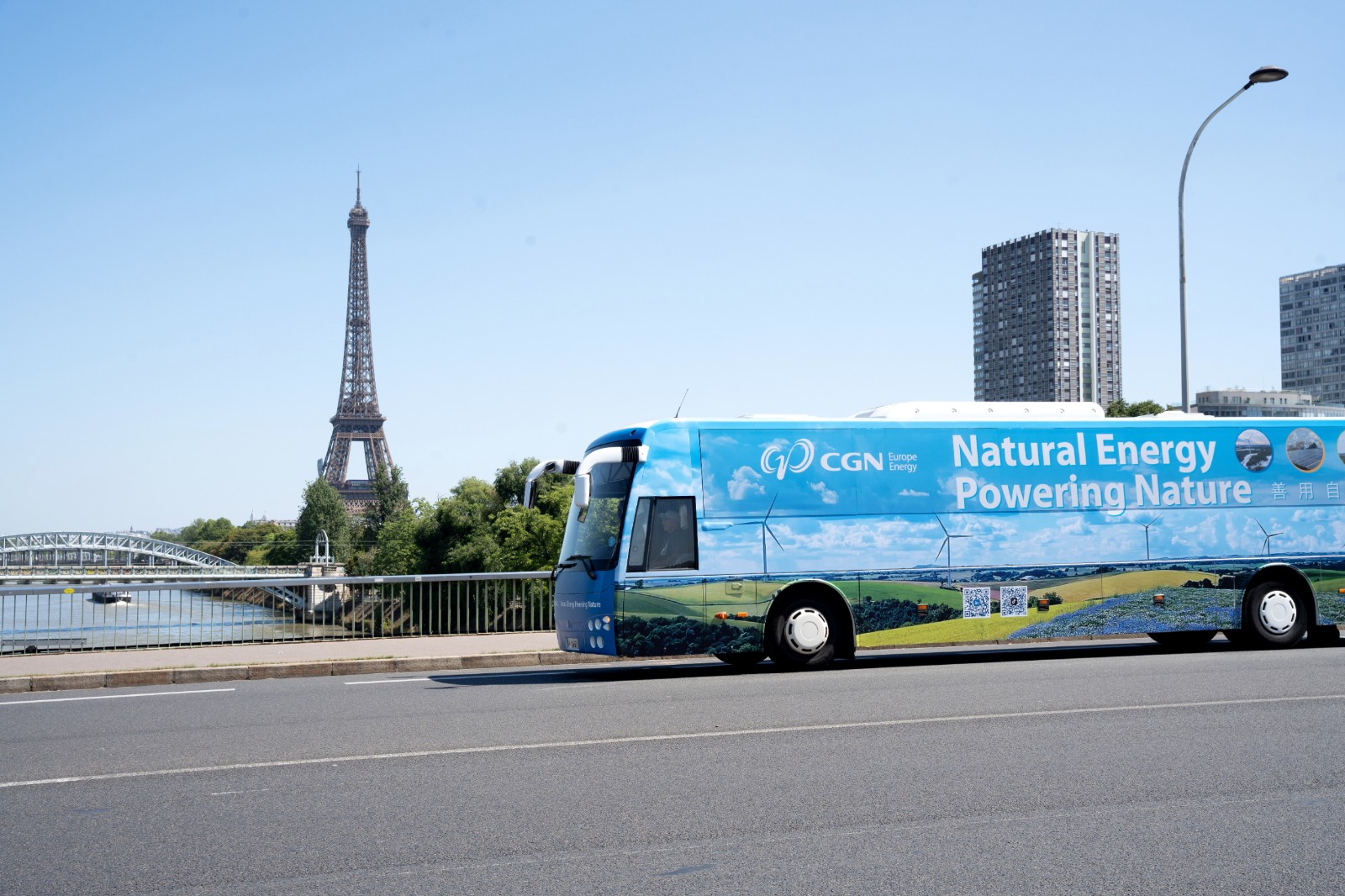 近日,一輛融合清潔能源元素的公共旅游大巴亮相巴黎,穿梭在古老的塞納河畔和現代的奧運場館間,車身上中廣核阿薩克風電場的風機花海與巴黎的藍天白云交相輝映,為奧運會增添了一抹綠色風景。