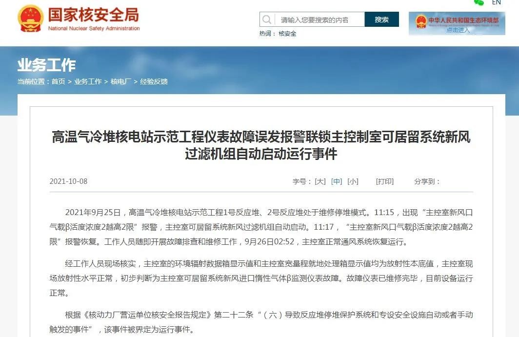 2021年9月11-12日,生態環境部(國家核安全局)組織監督組對華能山東石島灣核電廠高溫氣冷堆核電站示范工程首堆首次臨界進行監督見證。
