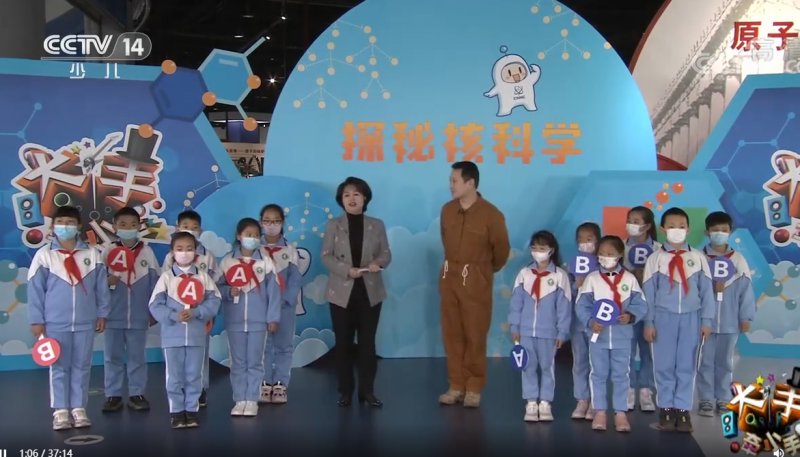 在中央廣播電視總臺少兒頻道《大手牽小手》節目之“走進中國原子能科學研究院”第四期鞠萍姐姐帶領著小朋友們在有趣的“核科學知識AB猜”環節中通過分組競猜模擬核裂變和核聚變等游戲活動在緊張有趣的氣氛中增長了許多核科學知識