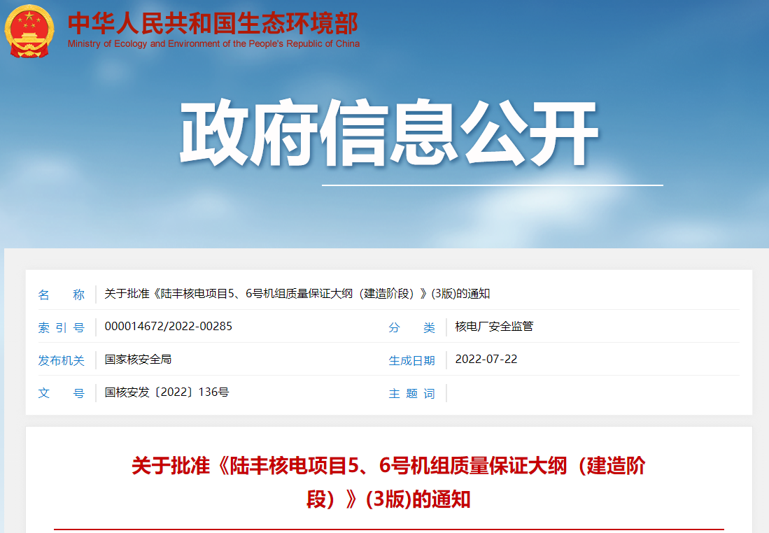 關(guān)于批準(zhǔn)《陸豐核電項(xiàng)目5、6號(hào)機(jī)組質(zhì)量保證大綱(建造階段)》(3版)的通知