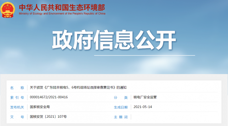 根據《中華人民共和國核安全法》及相關核安全法規,我局對你公司提交的《廣東陸豐核電5、6號機組選址安全分析報告》及相關文件進行了核安全技術審查,未發現場址存在影響廣東陸豐核電5、6號機組安全且不能采取工程措施解決的顛覆性因素。我局決定向你公司頒發《廣東陸豐核電5、6號機組場址選擇審查意見書》(國核安證字第2113號,見附件)。