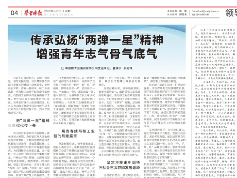 《學習時報》刊發余劍鋒署名文章 傳承弘揚“兩彈一星”精神 增強青年志氣骨氣底氣