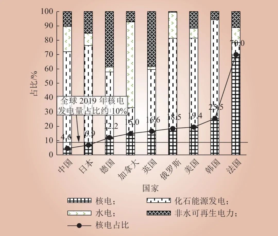 截止2020年,世界平均核電發電量占比10.4%,排名第一的法國占比70%。根據wind數據,中國2021核電發電量占比總發電量的5.02%。