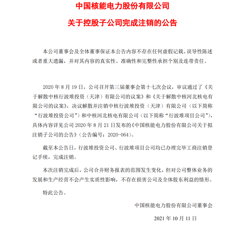 據中國核電10月11日公告顯示,中國核電旗下控股子公司行波堆投資公司、行波堆項目公司均已辦理完畢工商注銷登記手續,完成注銷。