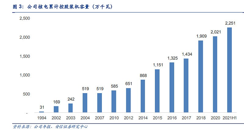 2021 年上半年,公司福清 5 號機組和田灣 6 號機組兩臺機組進入商業運行,共計裝機容量 229.7 萬千瓦時。其中福清 5 號機組為華龍一號全球首堆,大規模裝機陸續投產下公司核電機組裝機容量穩居行業前列。控股在建核電機組 6 臺,裝機容量 625.80 萬千瓦;合計2875萬千瓦(28.75GW)。