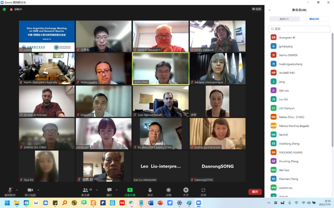 2022年7月14日,中國核能行業(yè)協會與阿根廷原子能委員會以視頻方式召開了中國-阿根廷小堆與研究堆經驗交流會,來自中阿雙方機構的81名專家參加了會議。協會先進核能專委會主任李曉明和阿根廷原委會主席阿德里安娜·塞爾奎斯女士出席會議并致辭。會議由協會先進核能專委會副主任田佳樹主持。