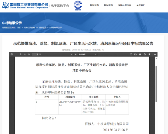 3月6日,中核新能源投資股份有限公司成功中標霞浦核電“示范快堆海淡、除鹽、制氯系統、廠區生活污水站、消泡系統運行項目”。