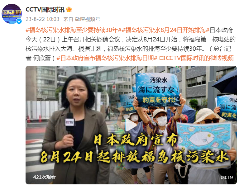 新華社快訊:日本政府22日宣布,將于8月24日啟動福島核污染水排海。