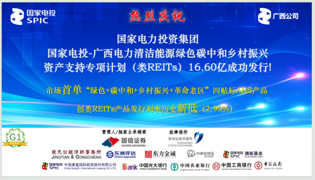 3月1日,國家電投在深交所成功發行“國家電投-廣西電力清潔能源綠色碳中和鄉村振興支持專項計劃(類REITs)”,發行規模16.60億元,發行成本2.99%,刷新類REITs產品自誕生以來成本最低紀錄,實現國家電投2024年類REITs業務開門紅。