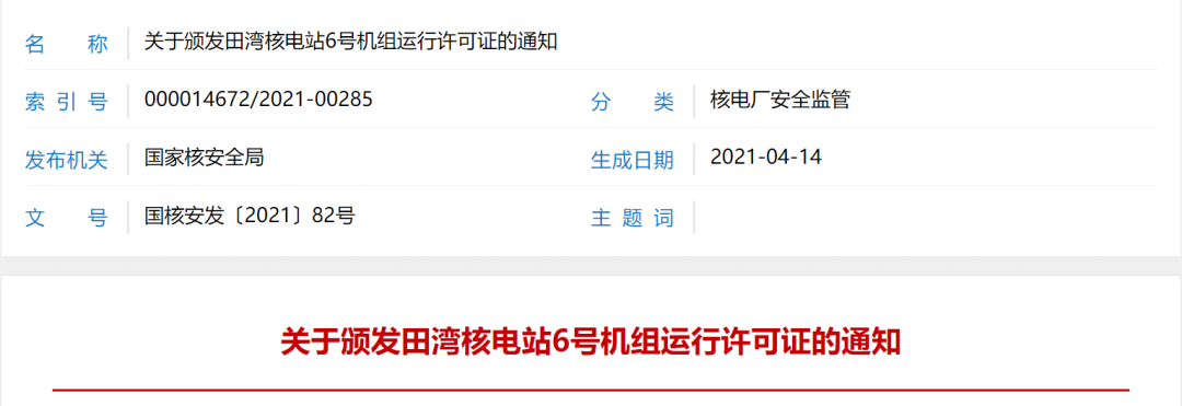 根據《中華人民共和國核安全法》《中華人民共和國民用核設施安全監督管理條例》的有關要求,我局對你公司提交的田灣核電站6號機組運行許可證申請書及相關文件進行了審查,認為該申請是可以接受的,決定頒發田灣核電站6號機組運行許可證。