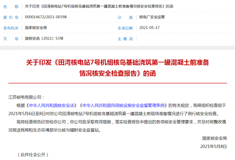 根據《中華人民共和國核安全法》《中華人民共和國民用核設施安全監督管理條例》的有關規定,我局組織檢查組于2021年5月6日至8日對你公司田灣核電站7號機組核島基礎澆筑第一罐混凝土前現場準備情況進行了例行核安全檢查。