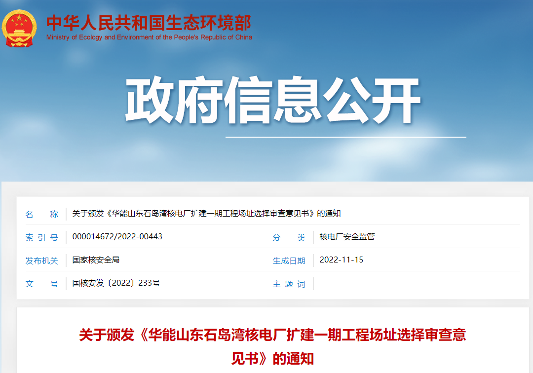 2023年2月14日,生態環境部官方網站發布了一份建設項目環境影響評價文件受理情況的公示,具體項目為華能山東石島灣核電廠擴建一期工程環境影響報告書(建造階段)。該報告書共490頁,分為十個章節,公示期為2023年2月14日——2023年2月27日(10個工作日)。