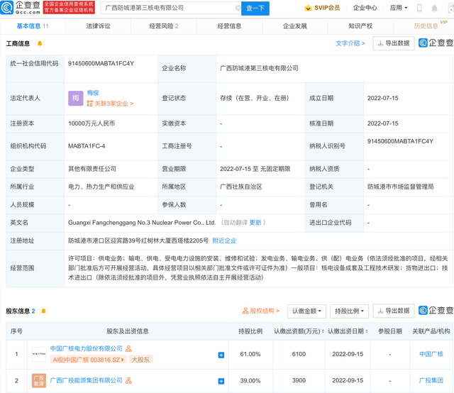 7月15日,廣西防城港第三核電有限公司成立,法定代表人為梅俊,注冊資本1億元人民幣,經營范圍包含:核電設備成套及工程技術研發;貨物進出口;技術進出口等。企查查股權穿透顯示,該公司由中國廣核(003816)、廣西廣投能源集團有限公司共同持股。
