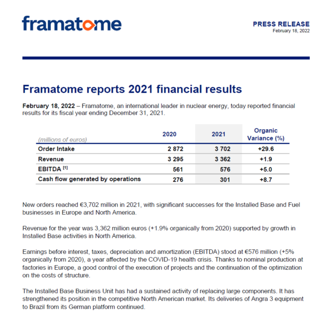 2022年2月18日,法國法馬通公司(Framatome)公布了2021年重要財務數據。主要由于北美運維和工程服務業務收入增加,法馬通2021年總收入為33.62億歐元,同比增長1.9%。