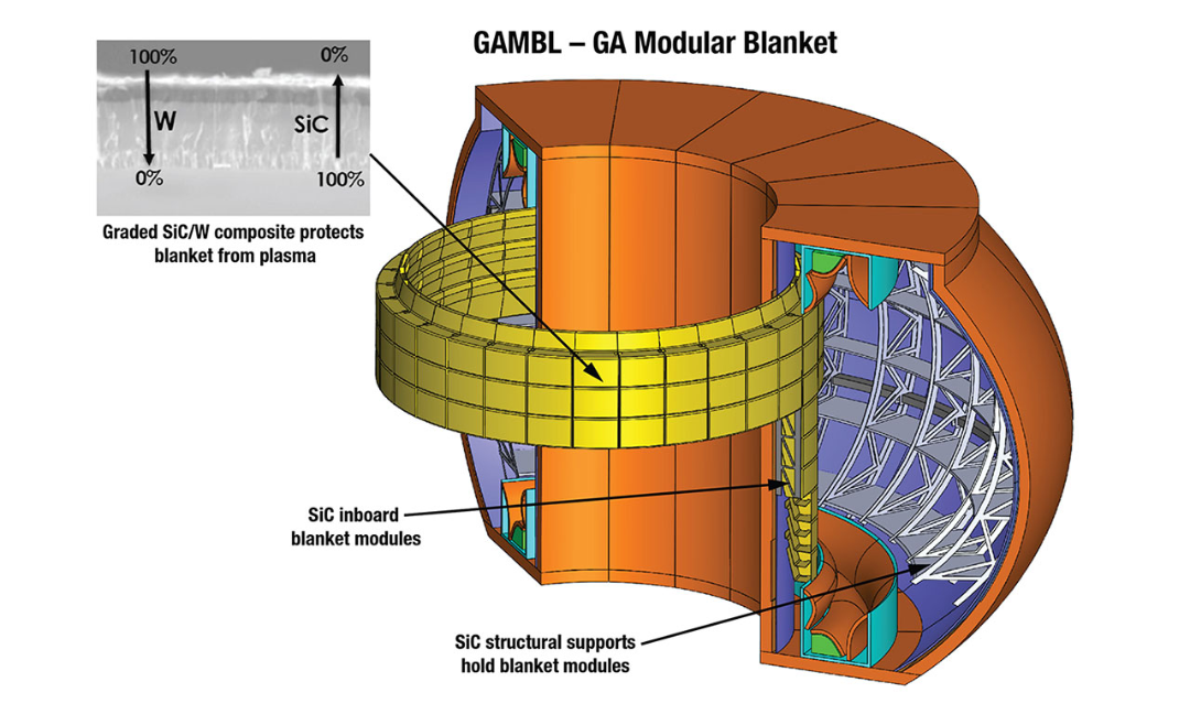 美國通用原子能公司(GA)宣布一種使用碳化硅基材料的新型聚變包層概念——通用原子能公司模塊化包層(GAMBL)。目前,聚變電廠的許多設計都使用低活化鋼制作包層之類的部件,因為它比傳統鋼更好地抵抗放射性。