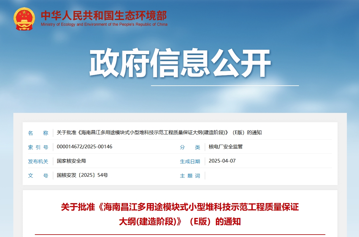 關于批準《海南昌江多用途模塊式小型堆科技示范工程質量保證大綱(建造階段)》(E版)的通知