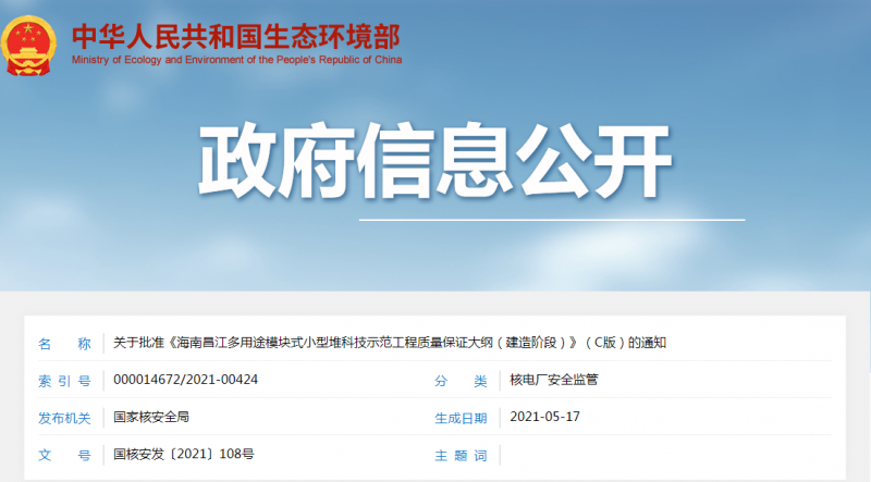 6月3日,中國核能電力股份有限公司發布上市公告。公告中指出,中國核電近期收到國家發展和改革委員會文件《國家發展改革委關于核準海南昌江多用途模塊式小型堆科技示范工程項目的批復》(發改能源〔2021〕733 號),該公司旗下的海南昌江多用途模塊式小型堆科技示范工程項目(小堆示范項目)已獲得國務院核準。