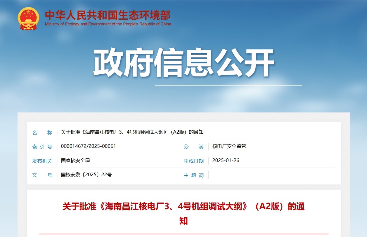 關(guān)于批準(zhǔn)《海南昌江核電廠3、4號(hào)機(jī)組調(diào)試大綱》(A2版)的通知