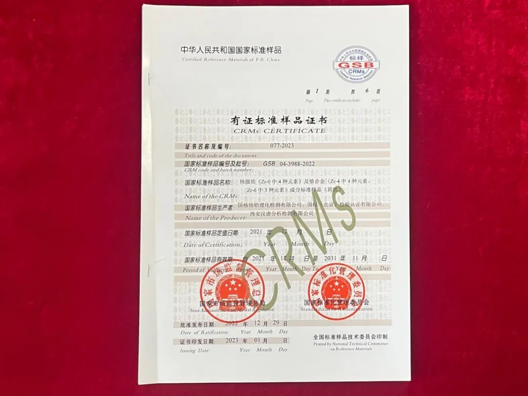 2月27日,國(guó)核鋯業(yè)收到由國(guó)家市場(chǎng)監(jiān)督管理總局和國(guó)家標(biāo)準(zhǔn)化管理委員會(huì)簽發(fā)的標(biāo)準(zhǔn)樣品證書。該標(biāo)準(zhǔn)樣品由國(guó)核鋯業(yè)理化檢測(cè)主導(dǎo)研制,經(jīng)全國(guó)有色金屬標(biāo)準(zhǔn)樣品鑒定會(huì)評(píng)審鑒定,是國(guó)內(nèi)首個(gè)獲批的核級(jí)鋯及鋯合金標(biāo)準(zhǔn)樣品,打破了我國(guó)核級(jí)鋯材檢測(cè)溯源、監(jiān)控長(zhǎng)期依賴進(jìn)口的局面。