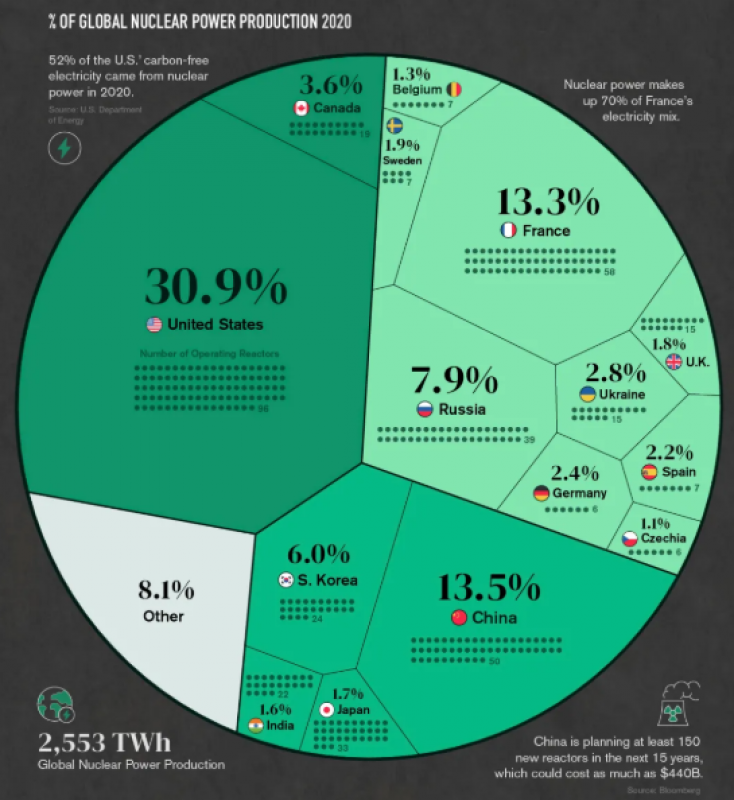 VirtualCapitalist網站發布全球核能信息圖。2020年全世界共有448座核電機組,發電量約占總量的10%,全球一次能源消費的4.3%。但是,盡管一些國家正在發展核能,但核能發電總體上自20世紀90年代達到頂峰以來有所放緩。前15個核電國家占全球核電產量的91%以上。
